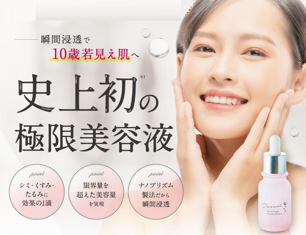 一般の美容液と違うのは、プラセンタの中でも栄養価が高く稀少なヴァージンプラセンタを贅沢に配合していること。通常のプラセンタの約20倍のアミノ酸が含まれており、小じわやたるみ、乾燥などのすべての肌トラブルに効果が期待できます。